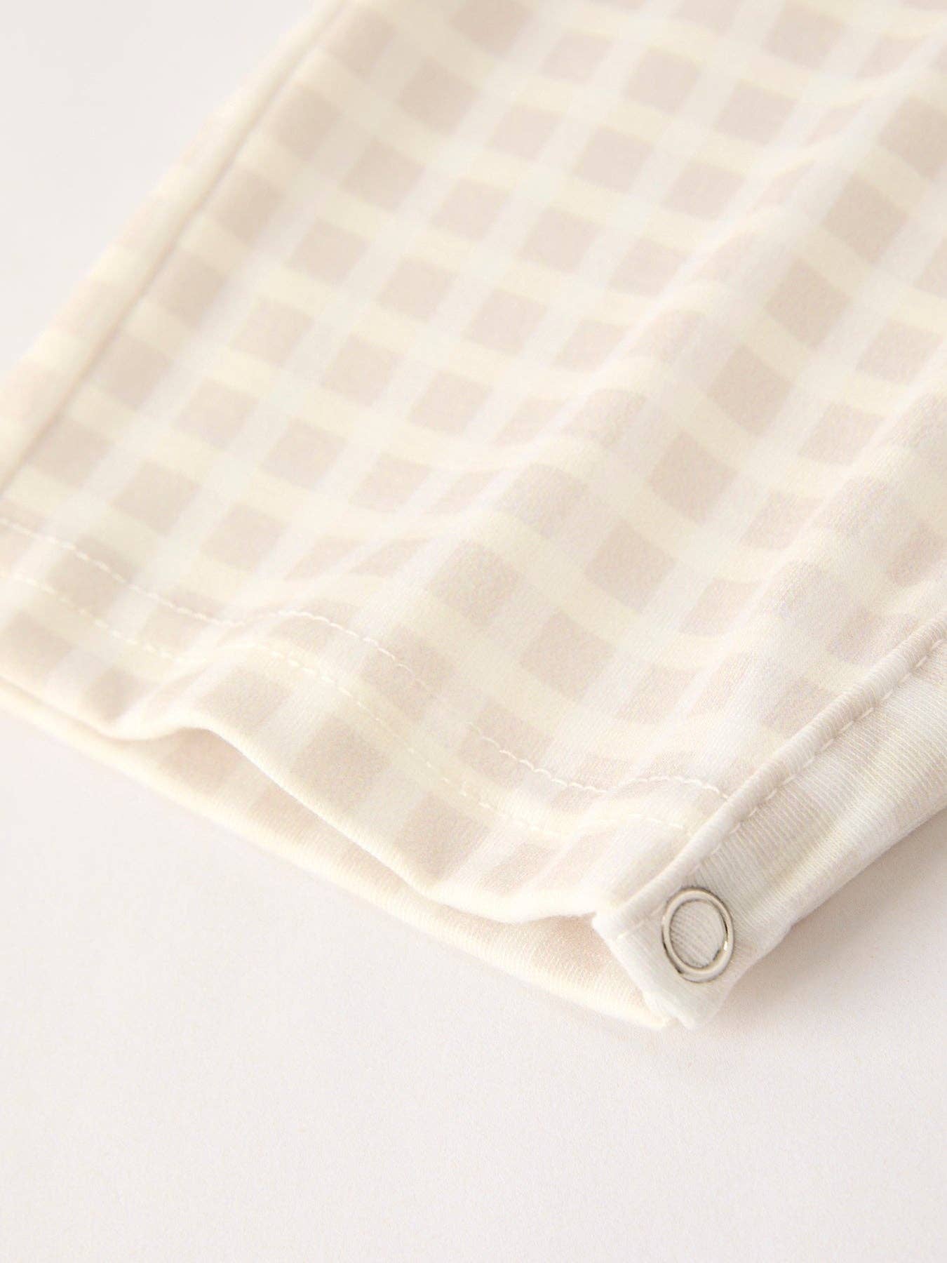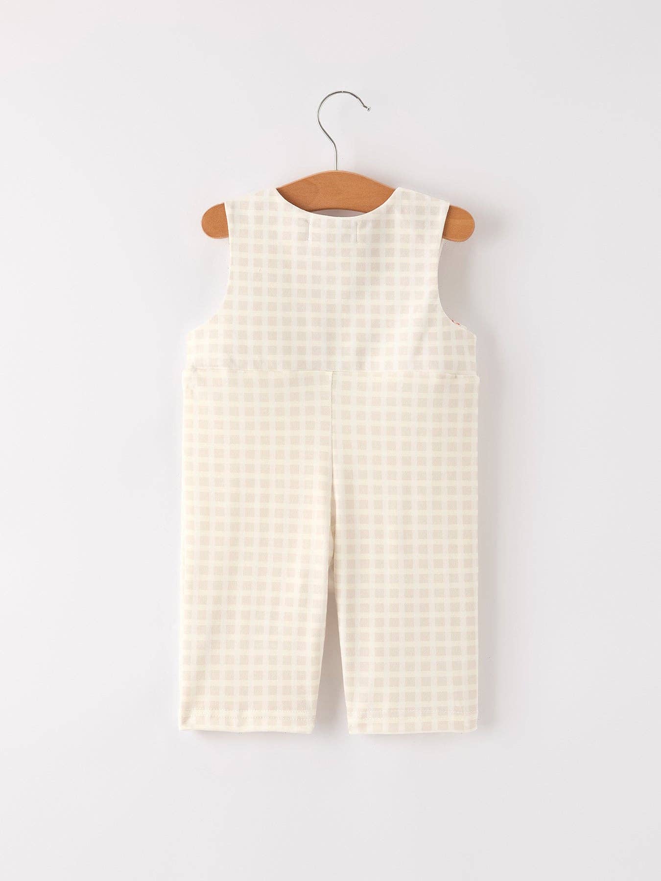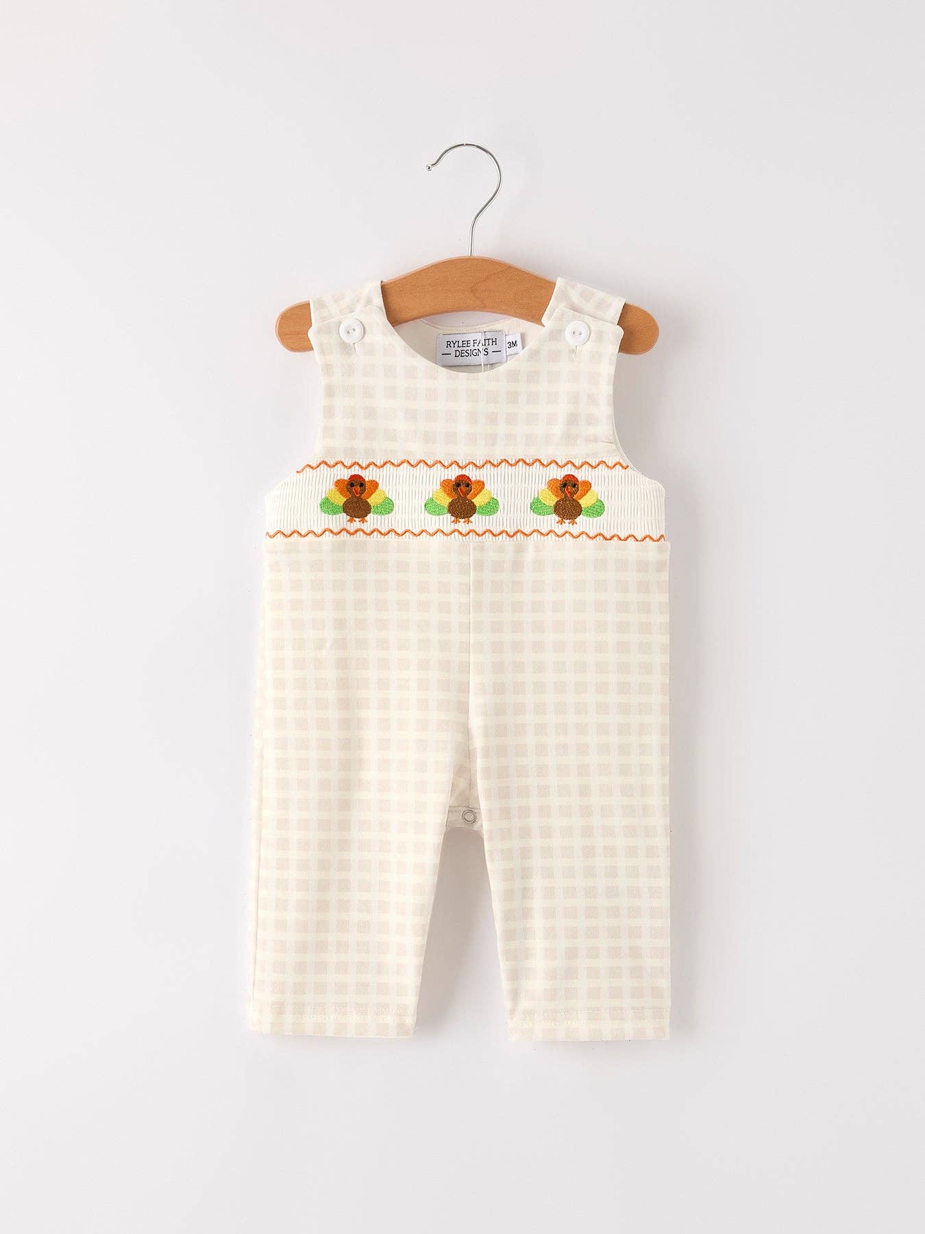 Classic and comfortable for his big day at the kids’ table. This handsome romper showcases the collection’s ivory mini-gingham and a smocked chest panel stitched with festive turkeys. Button straps and hidden leg snaps make changes easy, while the tailored straight-leg silhouette keeps him photo-ready.