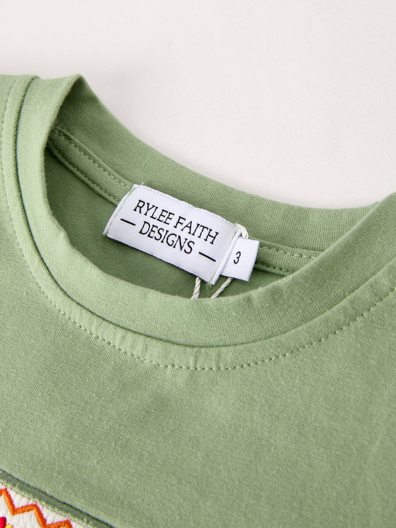 Festive and photo-ready. This comfy two-piece set pairs a soft sage knit tee with a smocked panel of trio turkeys and matching mint-gingham pull-on pants. Easy to wear and adorable for school feasts, family photos, and the big day at the kids’ table.