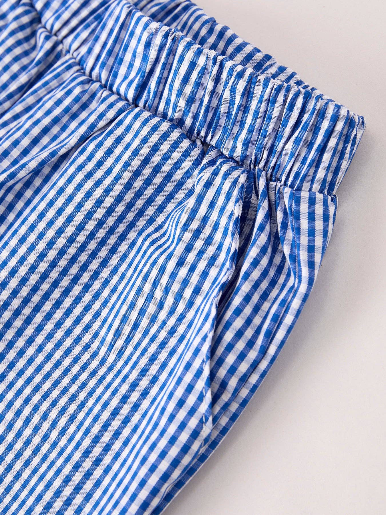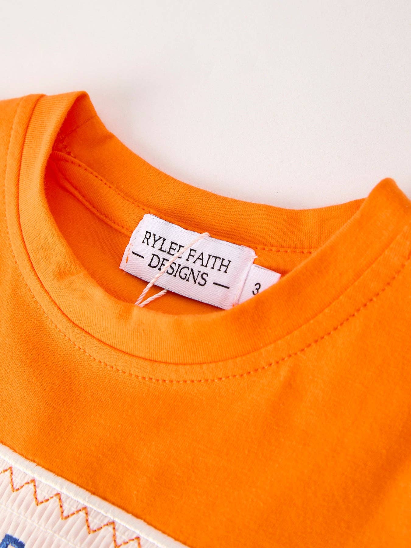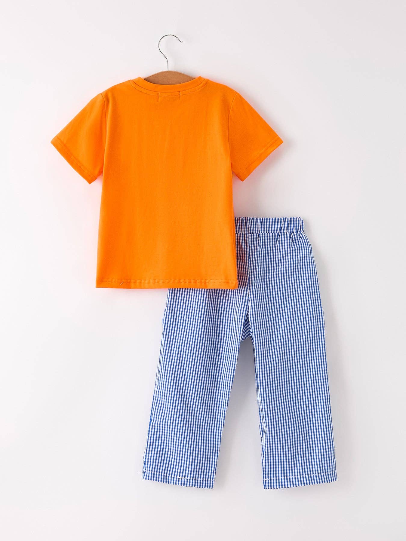 Bright, festive, and made for all his fall fun. This two-piece set pairs a pumpkin-orange knit tee with a smocked truck panel (hauling tiny pumpkins) and coordinating blue-gingham pull-on pants. Soft, breathable fabric keeps him comfy from pumpkin patch to parade.