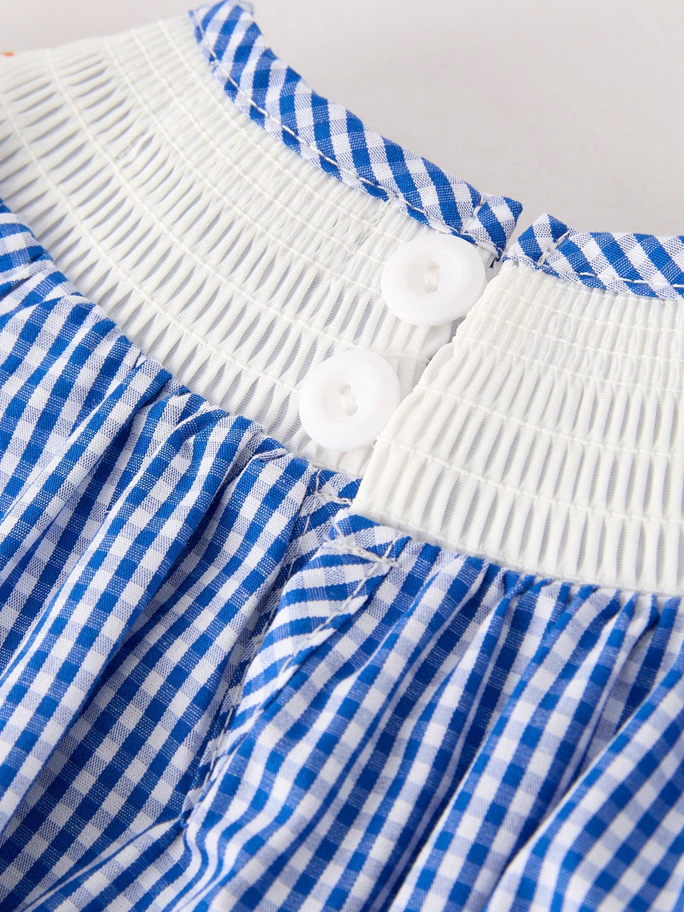 Sweet and comfy with a dash of harvest charm. This blue-gingham bubble features a smocked neckline of pumpkin-hauling trucks, puff sleeves, and pumpkin-orange bows at the legs. Elasticized openings and bottom snaps keep your little pumpkin cozy all day.