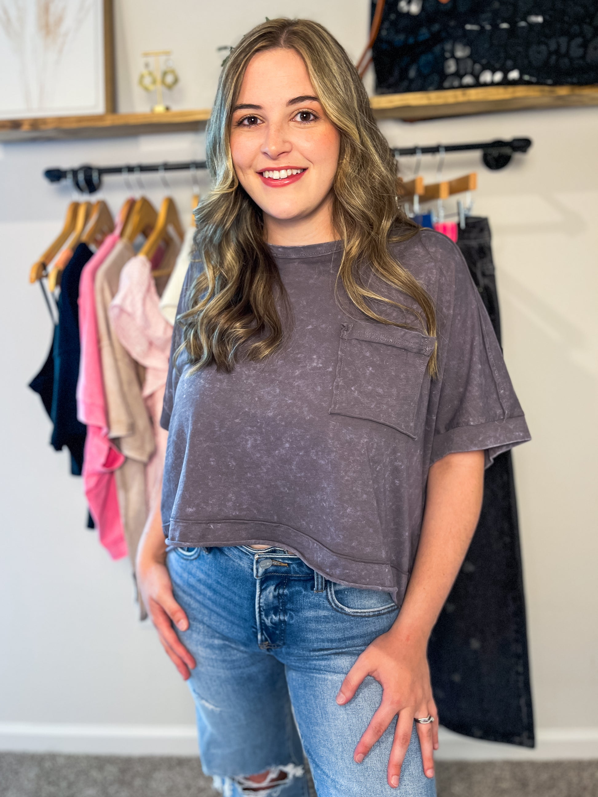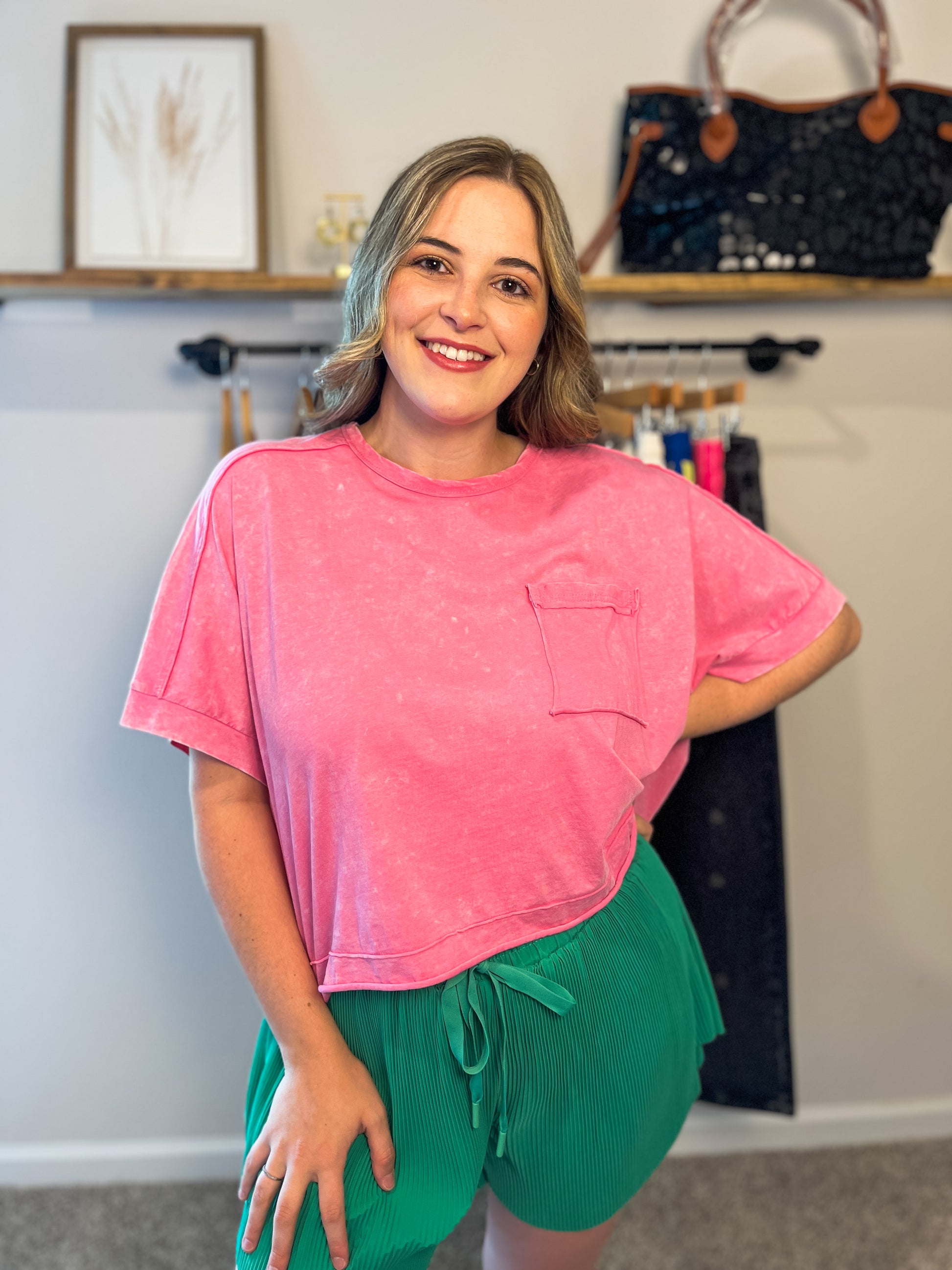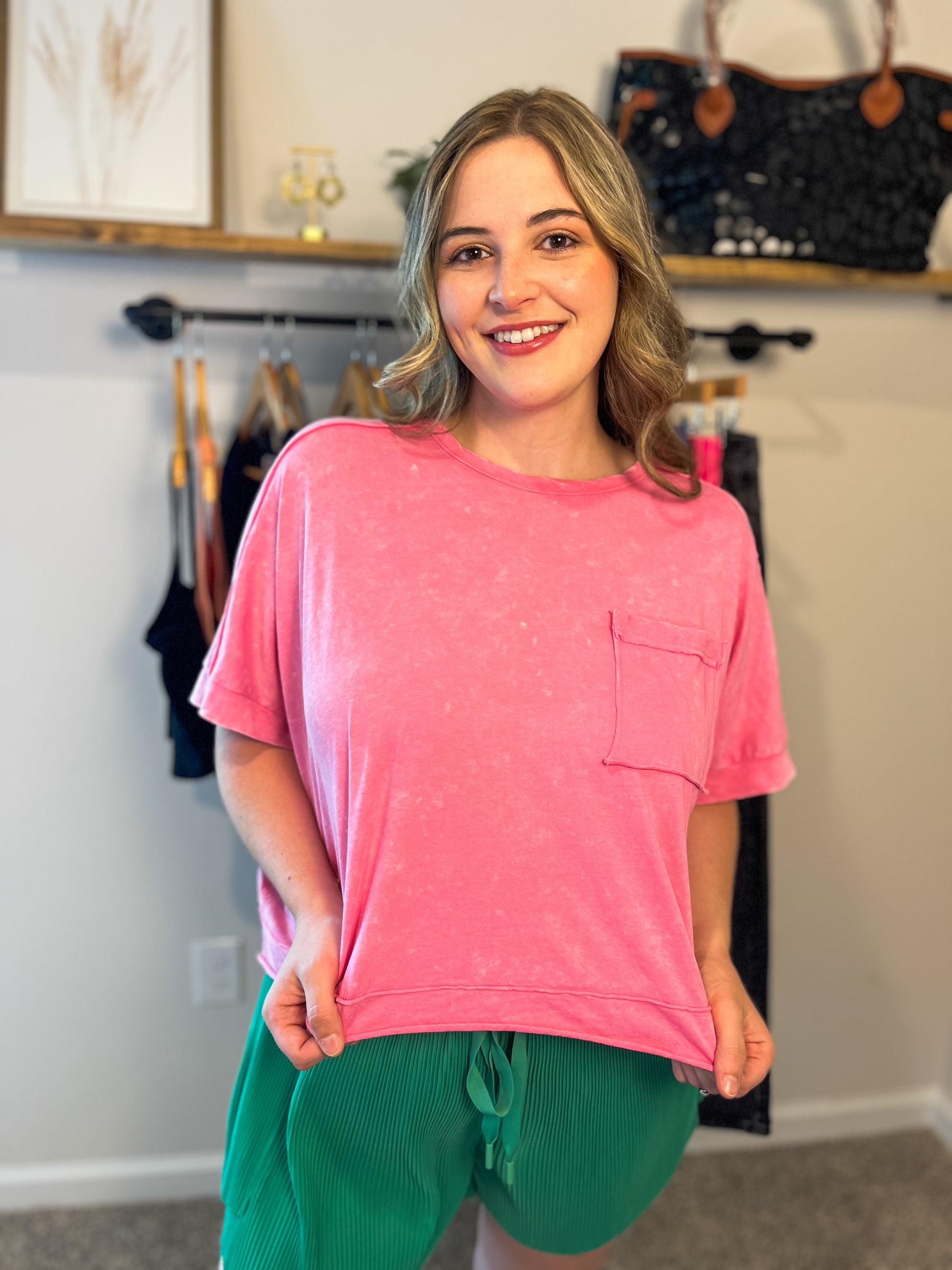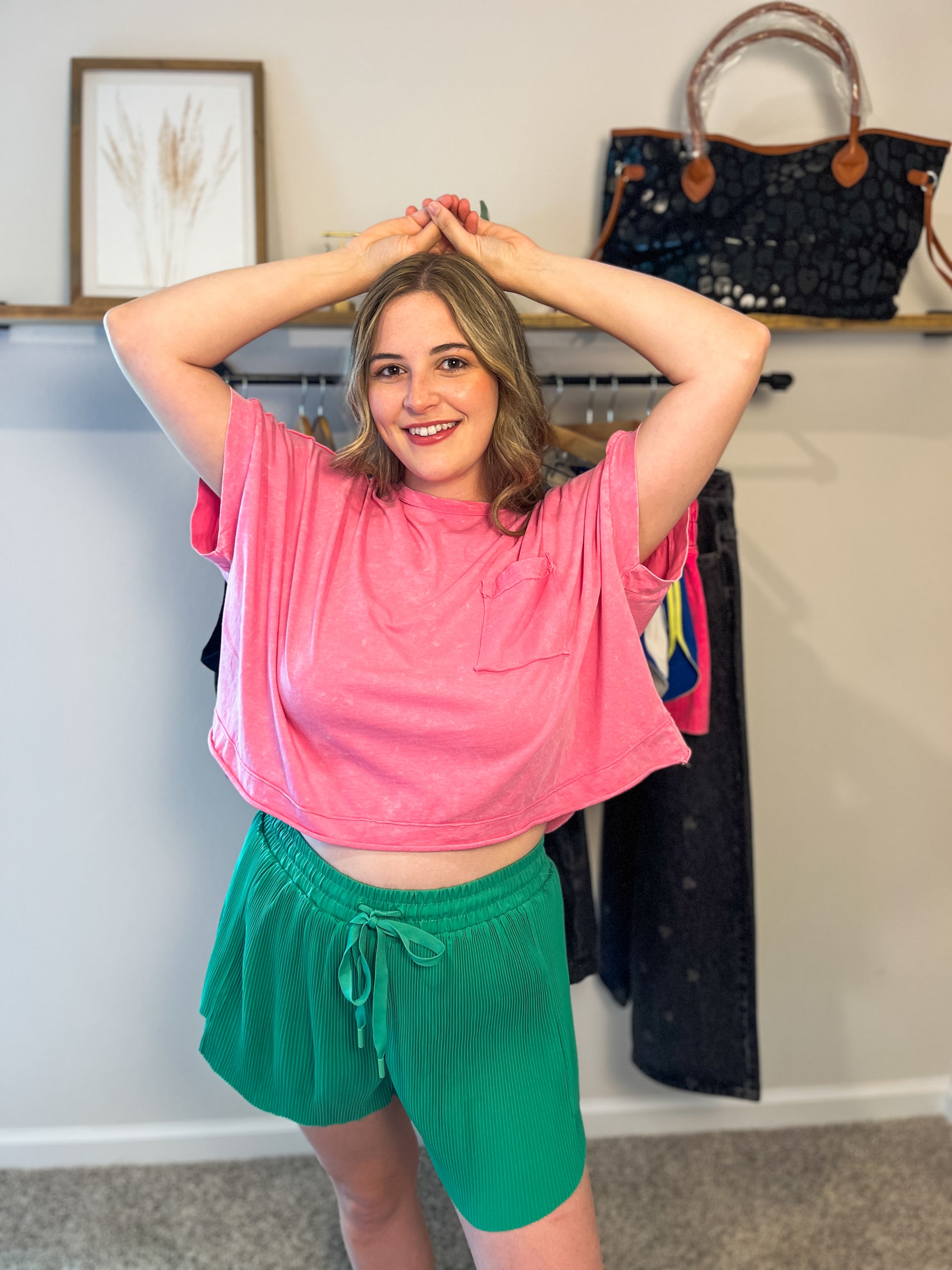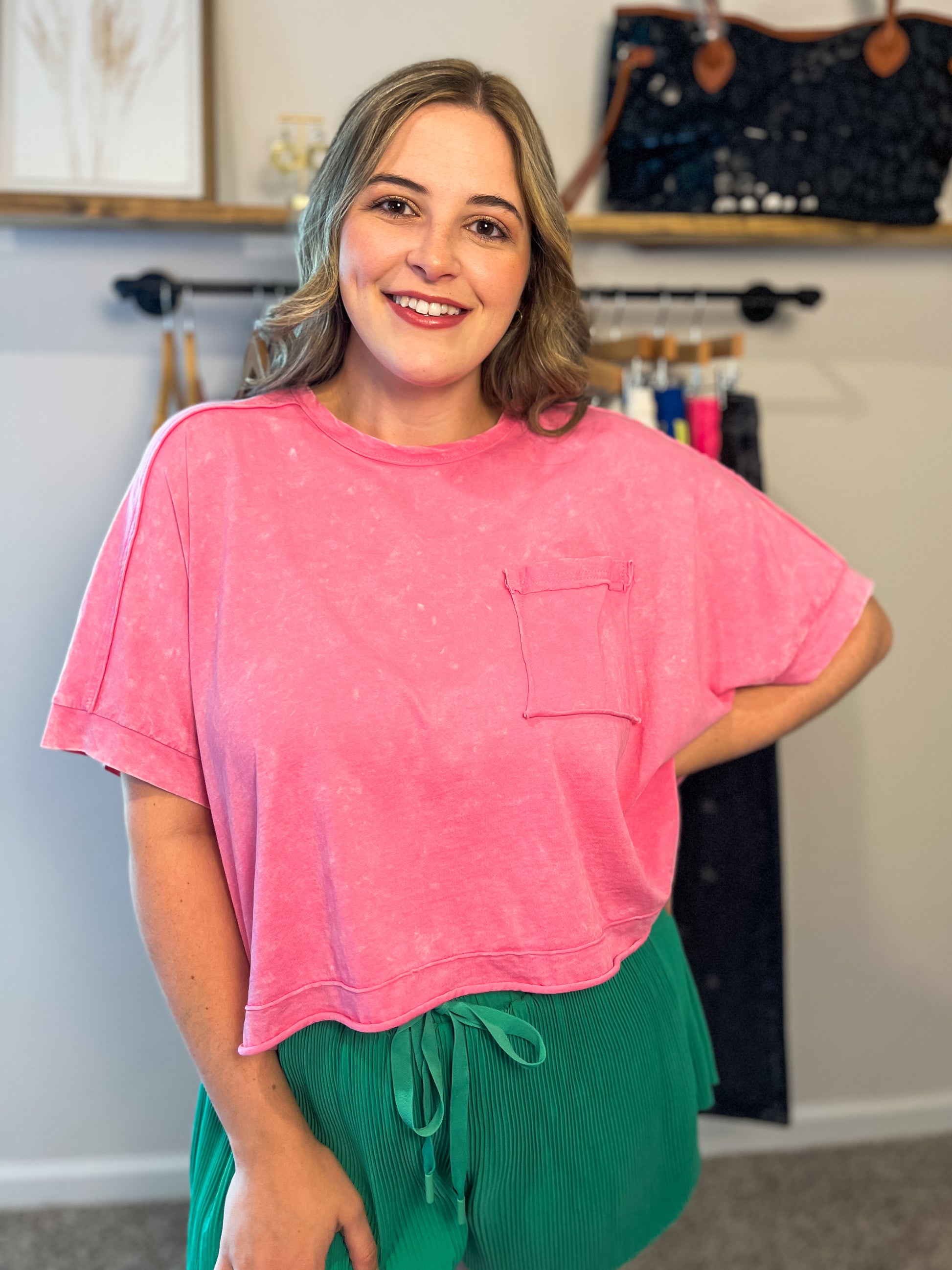 - Mineral Washed Oversized Crop Comfy Knit Top - Casual Comfy Spring Wardrobe Essential Style For Game Day - Basic Essential Washed Soft Knit Crop Top - Washed Soft Knit Top with Dolman Sleeve - Key Item of 90’s Activewear Fashion - Pink Girly Top Easy to Style with Casual Fit - Drop Shoulder - Short Sleeve - Patch Pocket - Round Neck - 100% COTTON