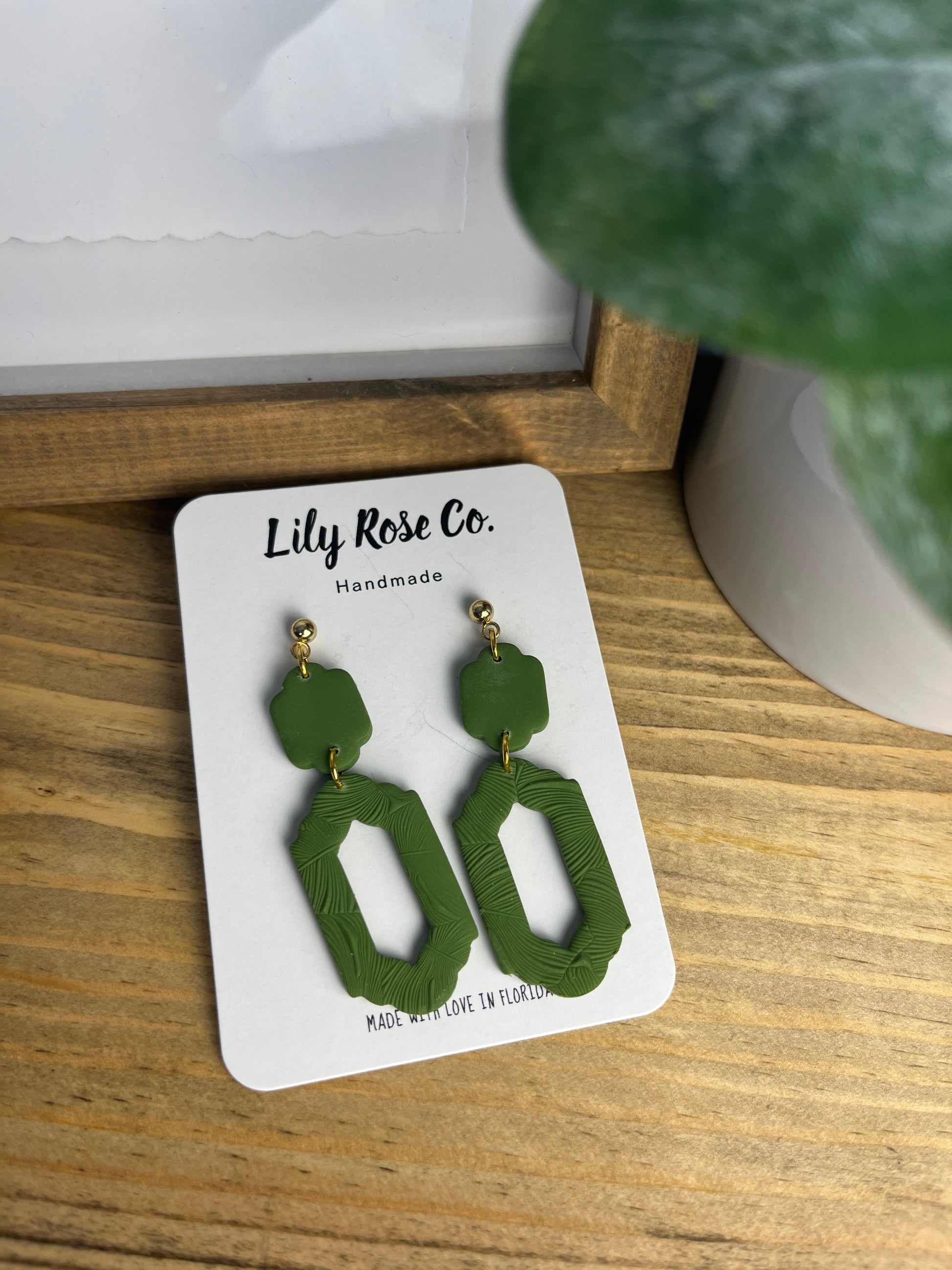 The Eden Grace Dangles feature modern geometric shapes in a rich, earthy green with subtle textured detailing. Bold yet minimal, these lightweight statement earrings bring a fresh, nature-inspired touch to your fall wardrobe.